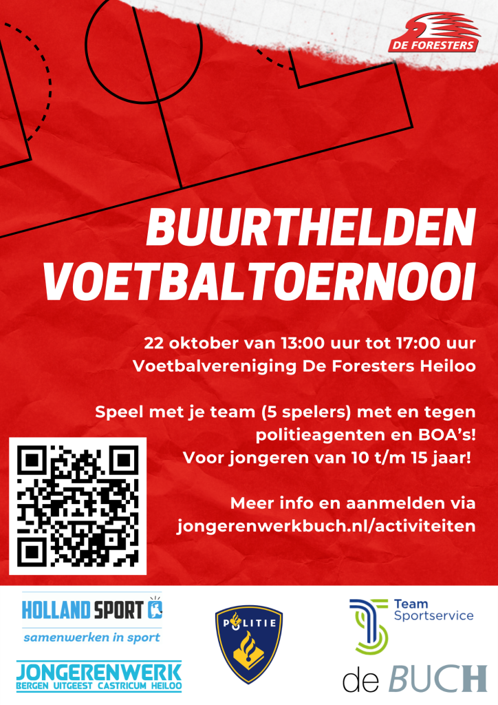 Bij het Buurthelden Voetbaltoernooi speel je met je team van 5 spelers samen met een politieagent of handhaver die ieder potje wordt toegewezen. Je mag meer dan 5 spelers in de team, maar dan moet er gewisseld worden. We spelen op kunstgras en je mag schoenen met noppen dragen.